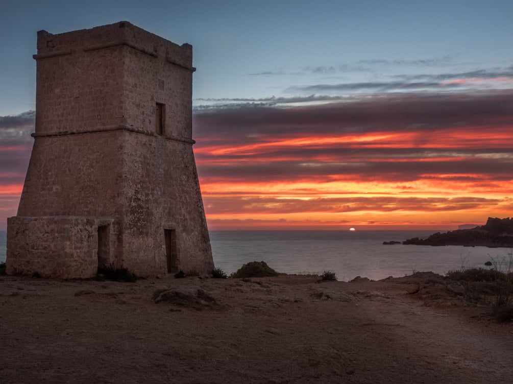 One of the many watchtowers found around the Maltese islands during an amazing vibrant orange sunset.